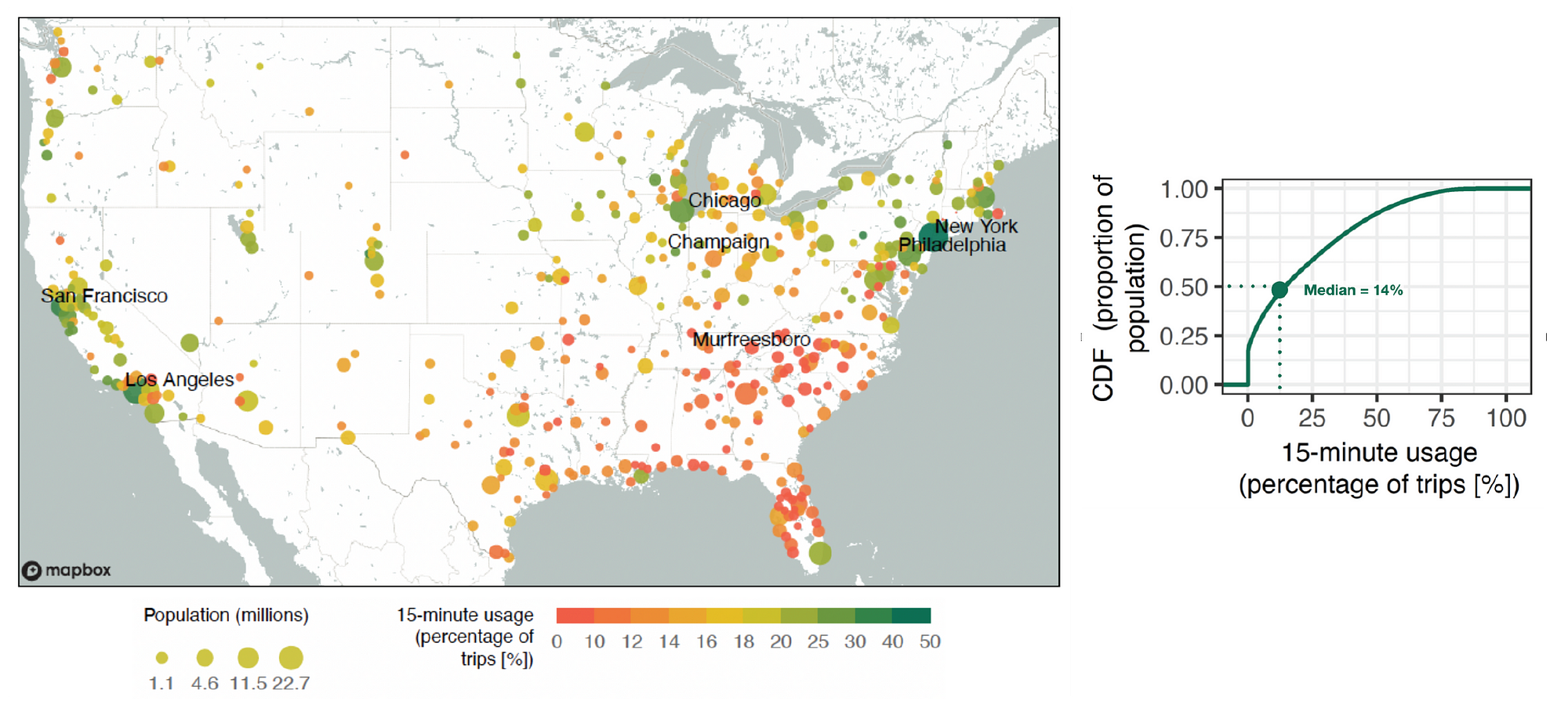 Using GPS data, we constructed a measure called 15-minute usage, which captures the percentage of trips to amenities and essential services from a given census block group within a 15-minute walk. We learned a few important things from this analysis: first, Americans are very far from achieving this idea, with half of all Americans living in census block groups where only 14% or fewer trips happen locally. Second, we found large geographic variation, with residents in cities in the Northeast, for example, making 32% of their trips within a 15-minute walk, while only 16% of trips in the South were within a 15-minute walk.