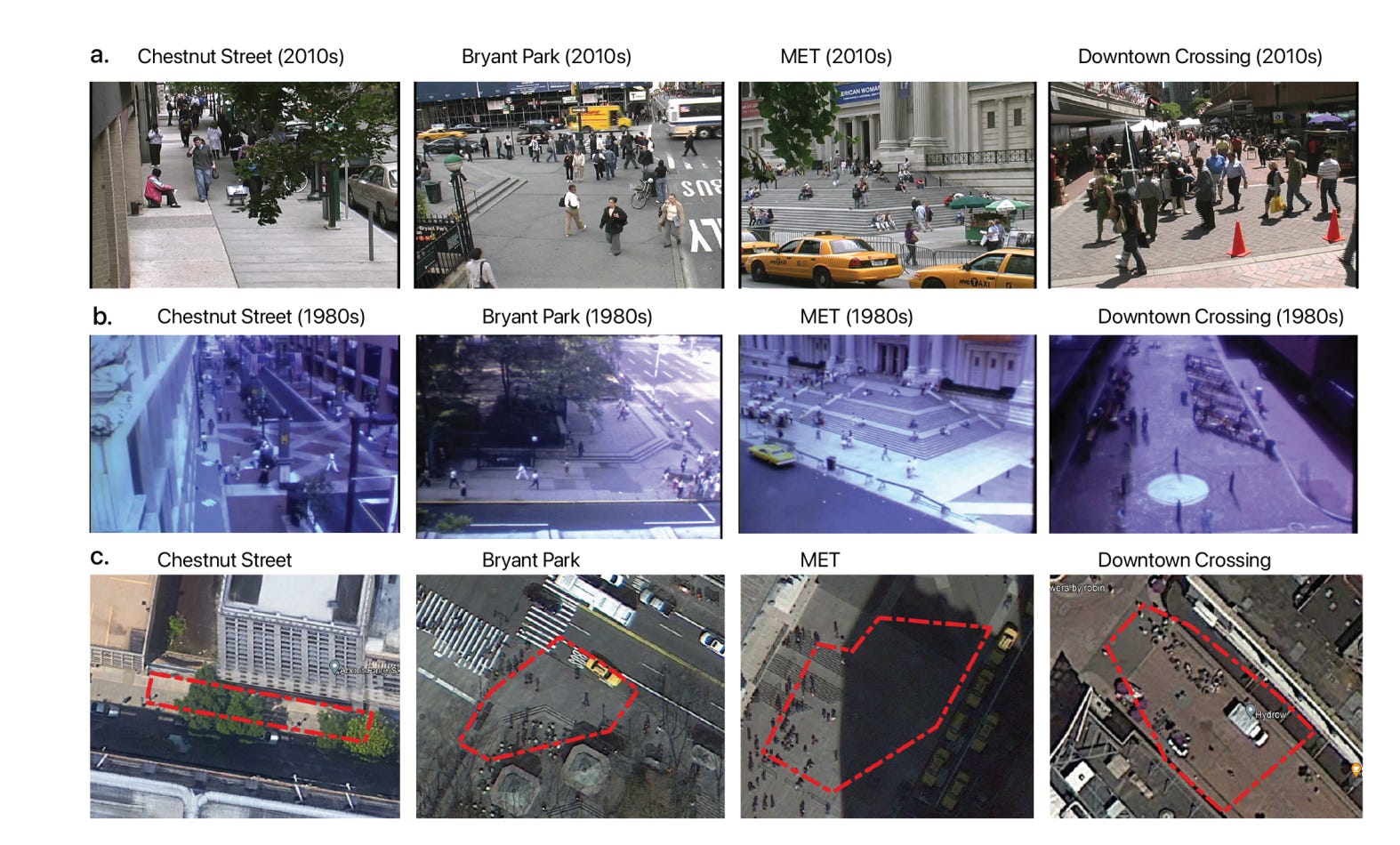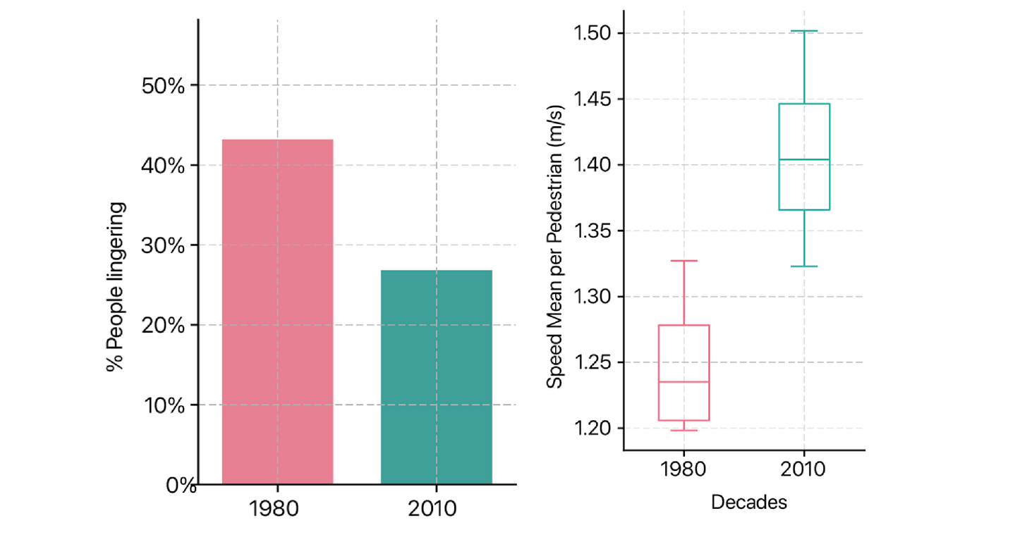 We had access to video footage of people walking and interacting in public places in Boston, New York City and Philadelphia in both 1980 and in 2010 (the places were Philadelphia’s Chestnut Street, Boston’s Downtown Crossing, and New York City’s Metropolitan Museum of Art and Bryant Park). These were videos collected by the sociologist William Whyte and his students, and they included four different public spaces. After reviewing the videos from 1980 and 2010 across the four sites, we found that in 2010 pedestrians were walking faster than in the 1980s by an average of about 15%. We also found that the time that people spent lingering in these public spaces had declined by half.