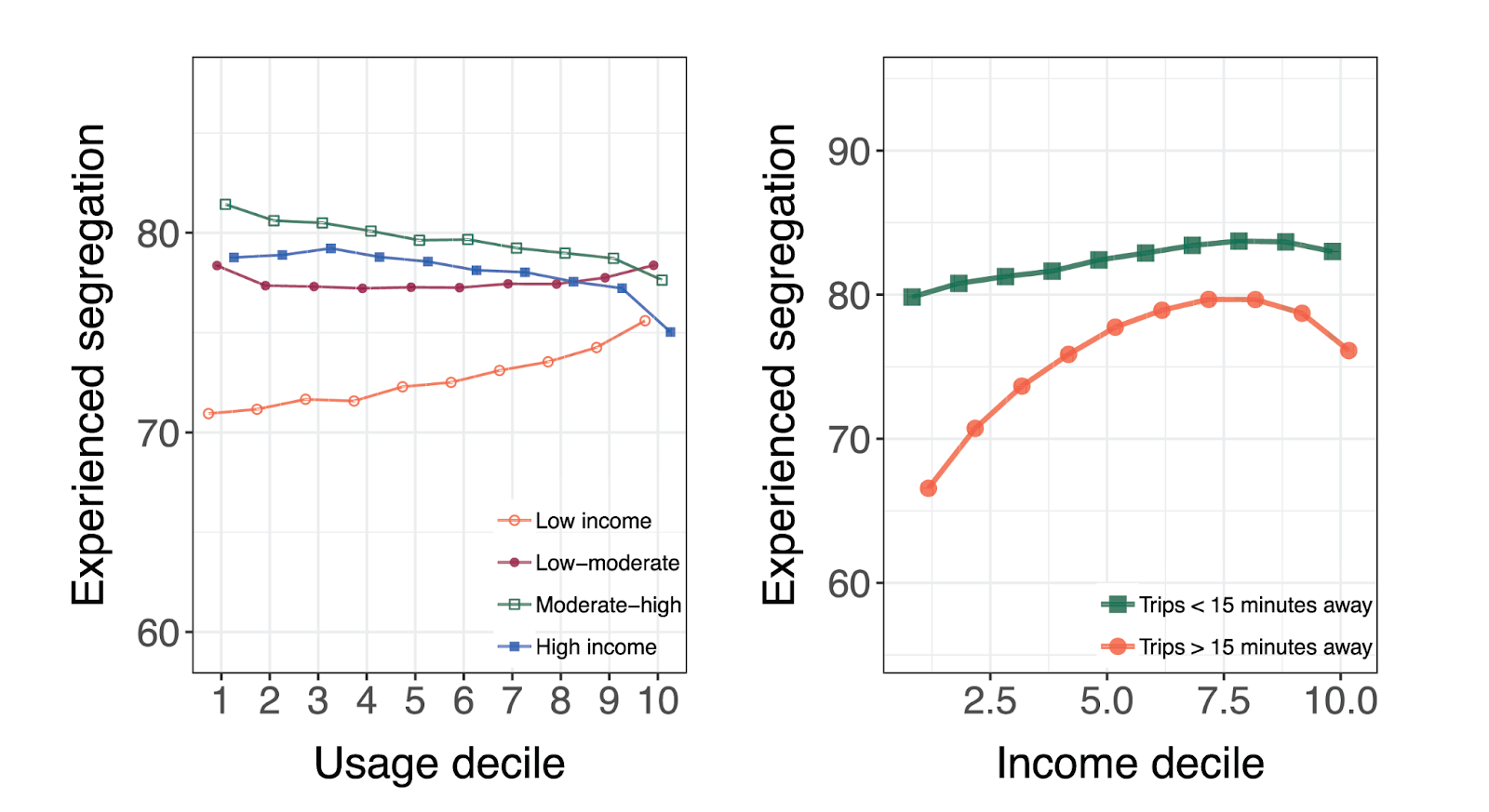 Our last major finding was that 15-minute cities could further economic segregation for people living in low-income neighborhoods. That’s because for residents in low-income neighborhoods, trips taken outside that 15-minute walk area provide a source of socioeconomically diverse encounters. What is interesting about this phenomenon is that we do not observe a similar situation for residents of high-income neighborhoods, which essentially means that if you have higher levels of income, whether you take a trip in your neighborhood or decide to leave it, you experience similar levels of social and economic segregation in both places. That is not true for people living in lower income neighborhoods.