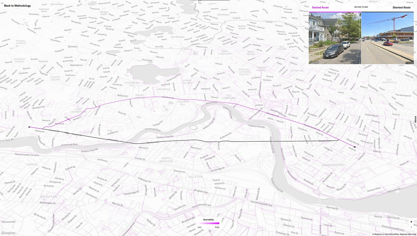 I’ve studied this topic in multiple different contexts. I’ll start with a project that’s called Desirable Streets, which took place in Boston. This project observed the paths people chose when walking to try and understand how the built environment influences walking behavior. Usually when people walk between any two locations, they take the shortest path available. Yet when people do not take that shortest path, they are giving us valuable information about their preferences. They are, in a sense, voting with their feet.