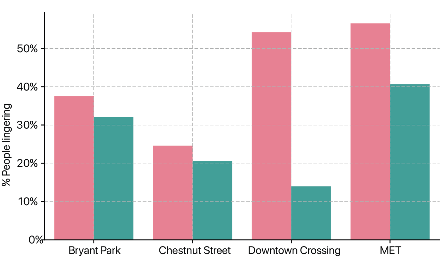 Another possibility is that the reduced interactions and increasing walking speed is related to rising incomes. As wages rise, the opportunity cost of time rises, meaning that people may walk faster and linger less because their time feels more valuable. We see evidence of this particularly in New York’s Bryant Park and Boston’s Downtown Crossing, where average incomes are high. In these two places we saw people walking faster and lingering less. However, we also saw that the Metropolitan Museum in New York City defied this pattern. There we saw higher levels of lingering, despite the Met being located in a high income neighborhood. We think that because the Met is a unique cultural amenity, it may be counterbalancing the time pressure effect.